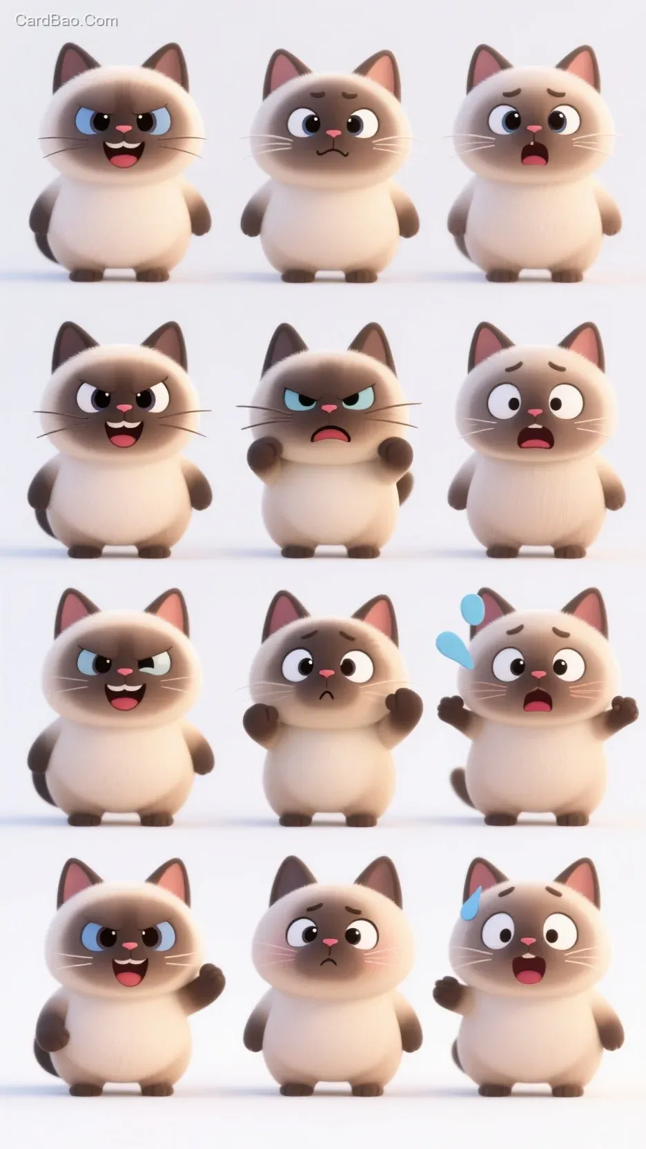 暹罗猫的 3D Q 版形象,胖嘟嘟的,脸部特写、表情特写,上半身,呈现开心、生气、害怕、惊讶等各种表情和动作,各种情绪,白色干净背景,Q 版,迪士尼风格,表情包,九宫格