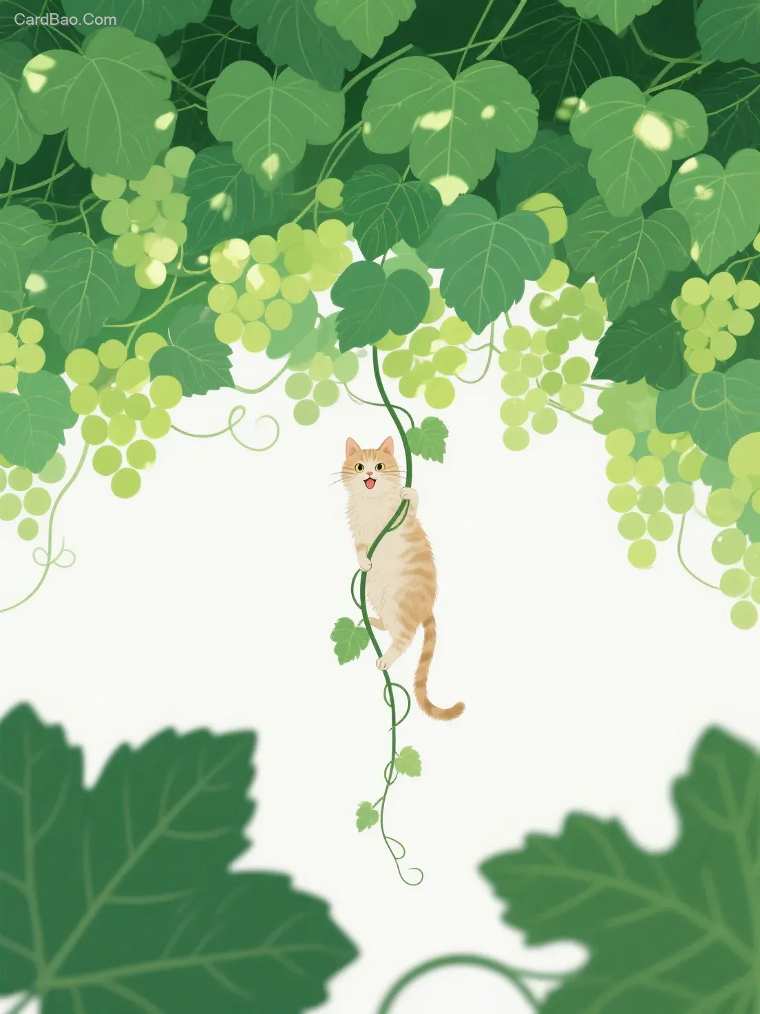 **焦点:** 画面正下方中心,一根纤细柔韧的葡萄藤优雅地垂落,藤蔓上攀着一只非常小巧、毛茸茸的猫咪,调皮可爱做鬼脸,一条小尾巴自然下垂或微微卷曲,为静谧注入一丝不易察觉的调皮生命力。