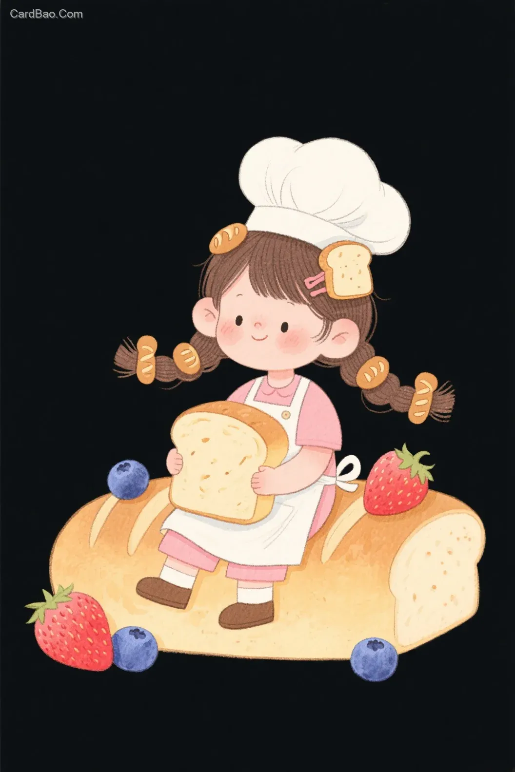 Watercolor line illustration featuring a little girl wearing a pastry chef's hat, adorned with bread-shaped hair clips and styled in twin tails with bread decorations. She is dressed in an apron chef outfit, holding freshly baked bread, sitting on a loaf of bread. The scene is embellished with strawberries and blueberries, creating a sweet, adorable, and playful atmosphere. The style is dreamy with a macaron color palette.
