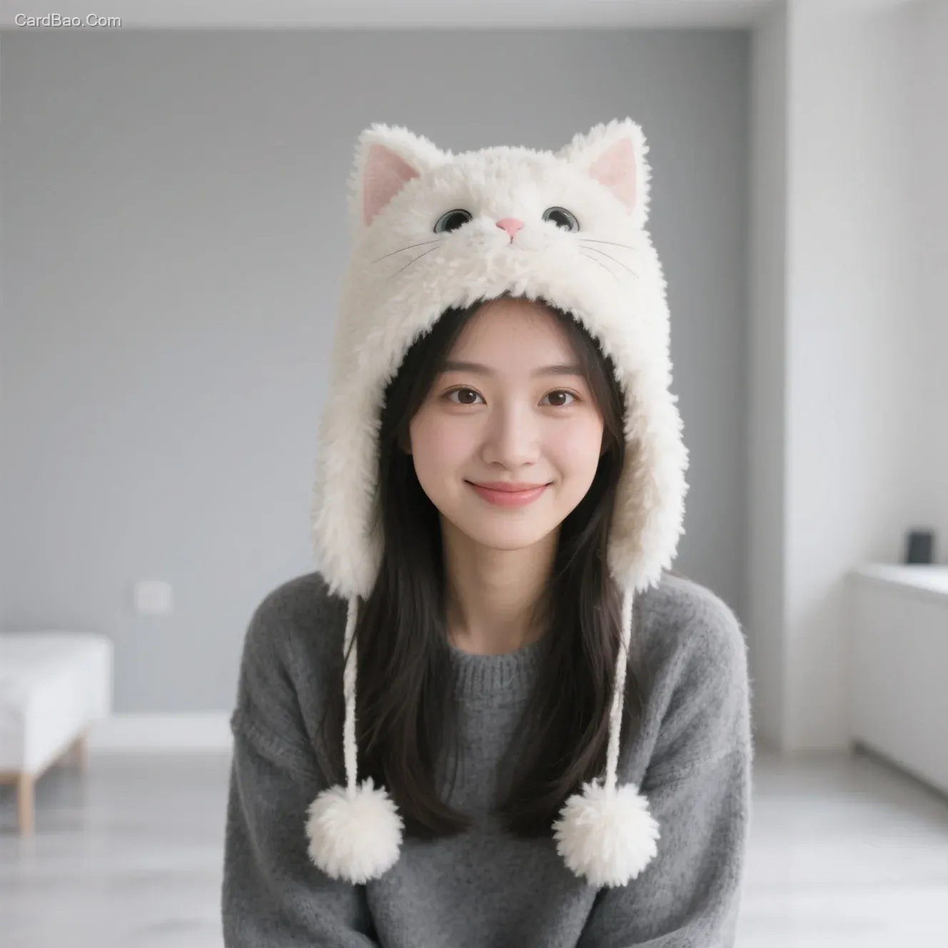 戴着猫咪帽子的美丽女孩,形象毛茸茸且可爱,灰色极简风格房间场景,极简风格,中景镜头,温馨可爱氛围,干净