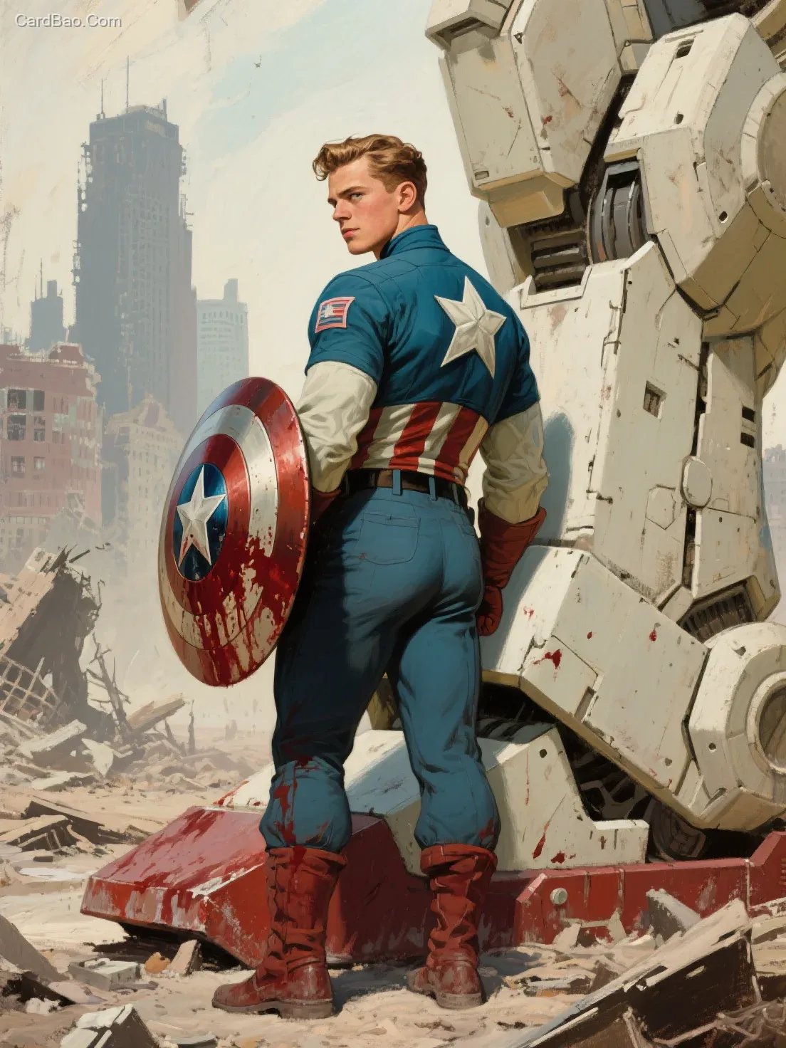 生成一张复古海报,30年代画报风格,美式复古油画,青年时期的美国队长背影,靠在巨型高达脚下,穿着一件美队制度,一只提着带血的盾牌,回头看着镜头,眼神坚毅,臀腿发达,臀部很肥,色彩对比强烈,明显笔触,没有文字