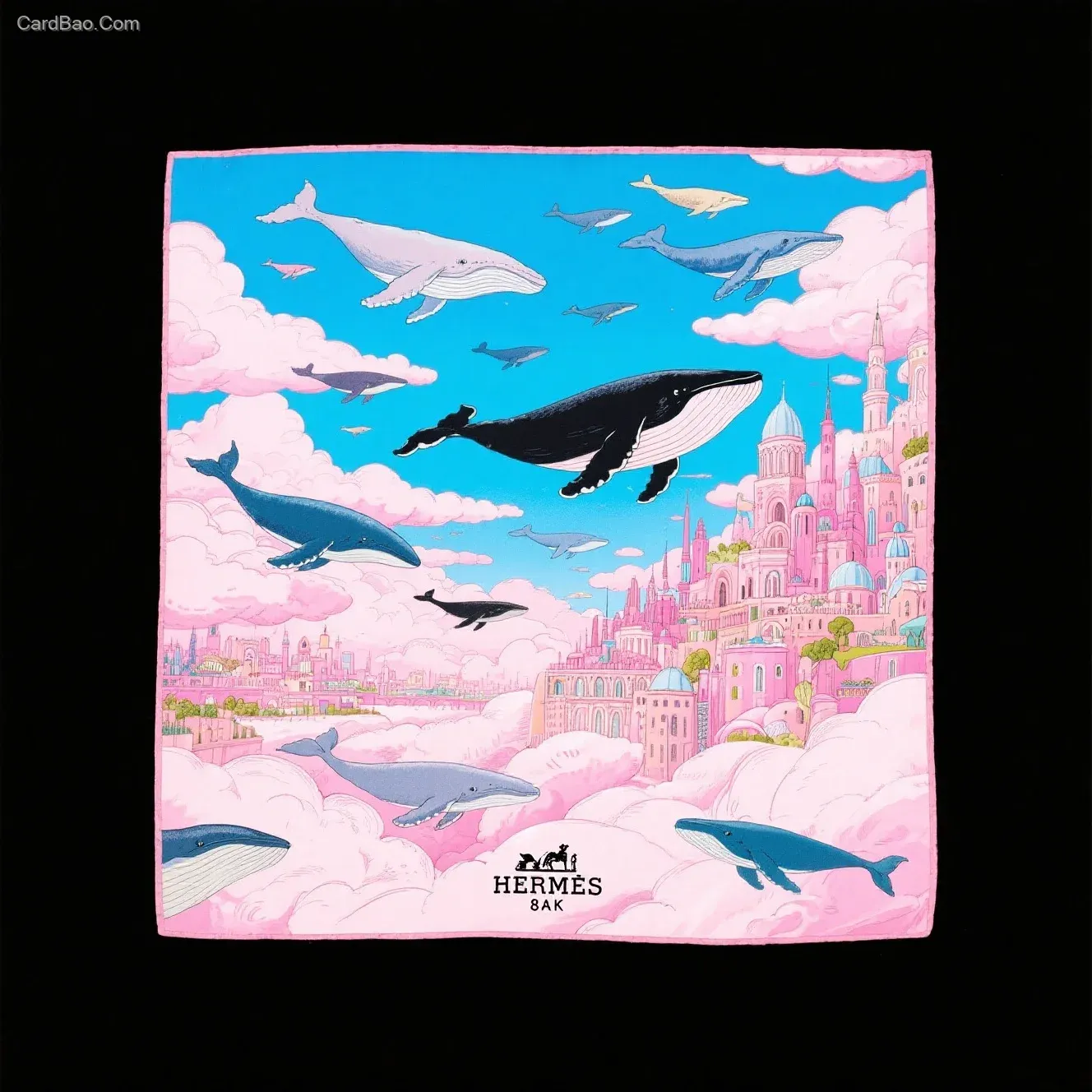 爱马仕丝巾方巾效果图:爱马仕插画大师杰作,极繁主义,复古插画,时尚插画,Karlotta Freier的风格,画面下方有黑色爱马仕的小LOGO。梦幻系列,一个天空之城,漂浮在天空中,有云朵,云朵中有一只鲸鱼在遨游。城内有各种奇异的景象,独特的视角。梦幻般的风格,细腻的笔触,创新的撞色技法。治愈系插画,8K高清画质。