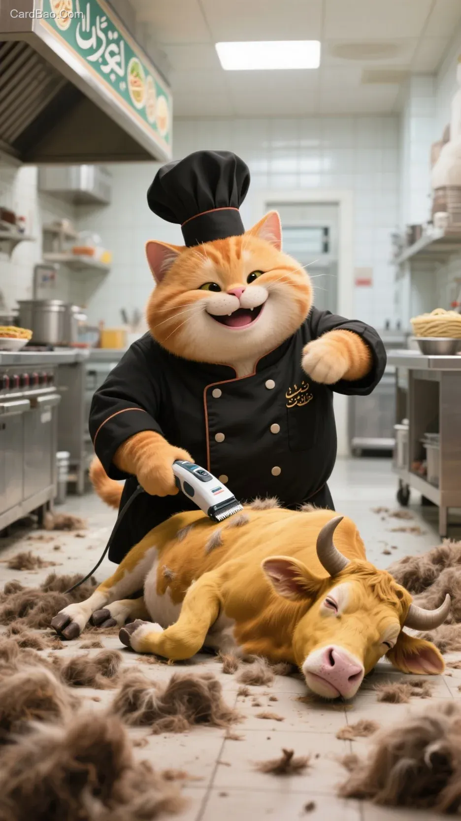 请生成一张图片,画面中是一只拟人化的憨态可掬的肥胖橘猫面带笑容穿黑色厨师服面带笑容正在给一只拟人化黄牛剃毛的画面,橘猫面前侧躺着一只瘫软晕厥的黄牛,橘猫左手拿电动剃须刀对准黄牛背部不停划拉,像是非常熟练的样子,周围地上一堆牛毛,背景是回族拉面店厨房里的陈设,宽敞干净整洁,写实风格,8K高清