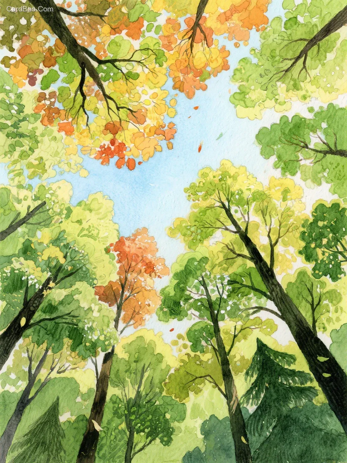 插图,秋天,仰望天空,郁郁葱葱的森林,生机勃勃,绿意盎然,水彩风插画,大师级构图,高清图,多彩