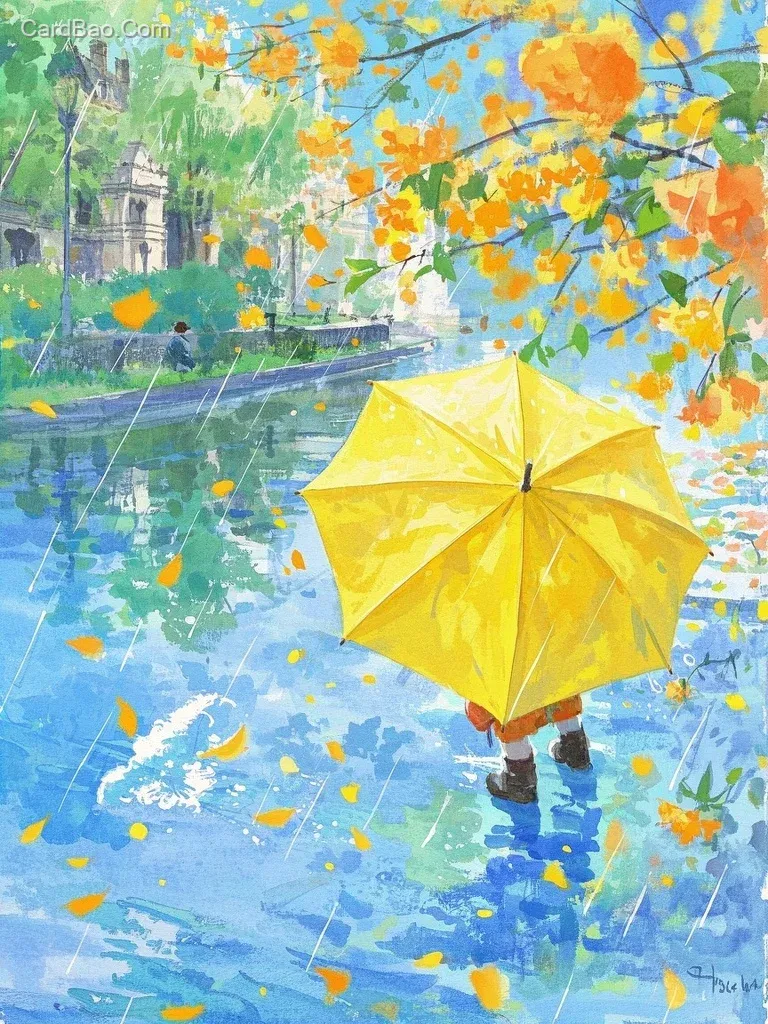 High-detail texture, the soft texture of petals, the reflective light of raindrops, the overall picture is full of poetry | Slowly zooming out from a close-up, showing the transition from details to the whole, highlighting the beauty of falling flowers and the sense of spring withering. The ground is covered with fallen flowers, the petal texture is clear, the raindrops reflect light, the courtyard is full of spring, the tree is in full bloom, high-detail texture, soft texture, poetic picture. Under the tree, a very small child is holding a large yellow umbrella, completely covering the whole person. The image style is watercolor painting.