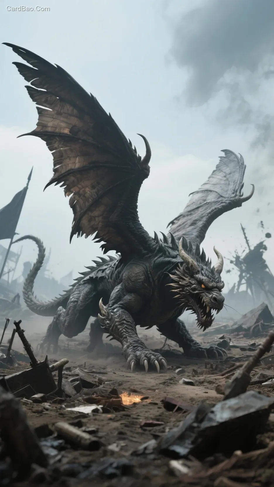 The ancient ferocious beast Qiongqi, with its massive wings and enormous body, crouches on the battlefield. The details are intricate and vividly rendered, capturing every minute aspect. The atmosphere is desolate and ruined, with a style that is photorealistic.