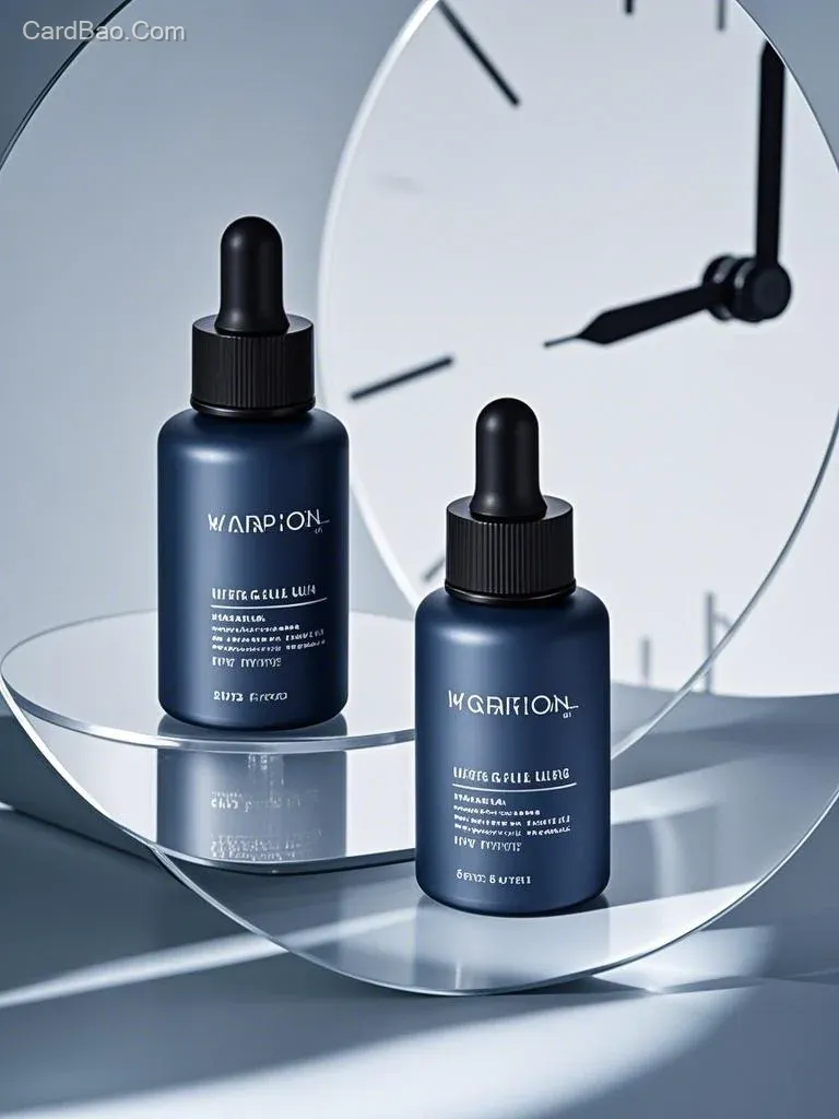 图片展示了两瓶滴管精华,整体画面呈现出科技感与精致感。磨砂哑光深蓝色瓶身,黑色瓶盖;背景中,冷调灰蓝色调,一个全白色简约时钟占背景右上方三分之二大,自然光影,哑光倒影,营造出高端、专业的护肤场景氛围,突显产品的科技感与品质感。