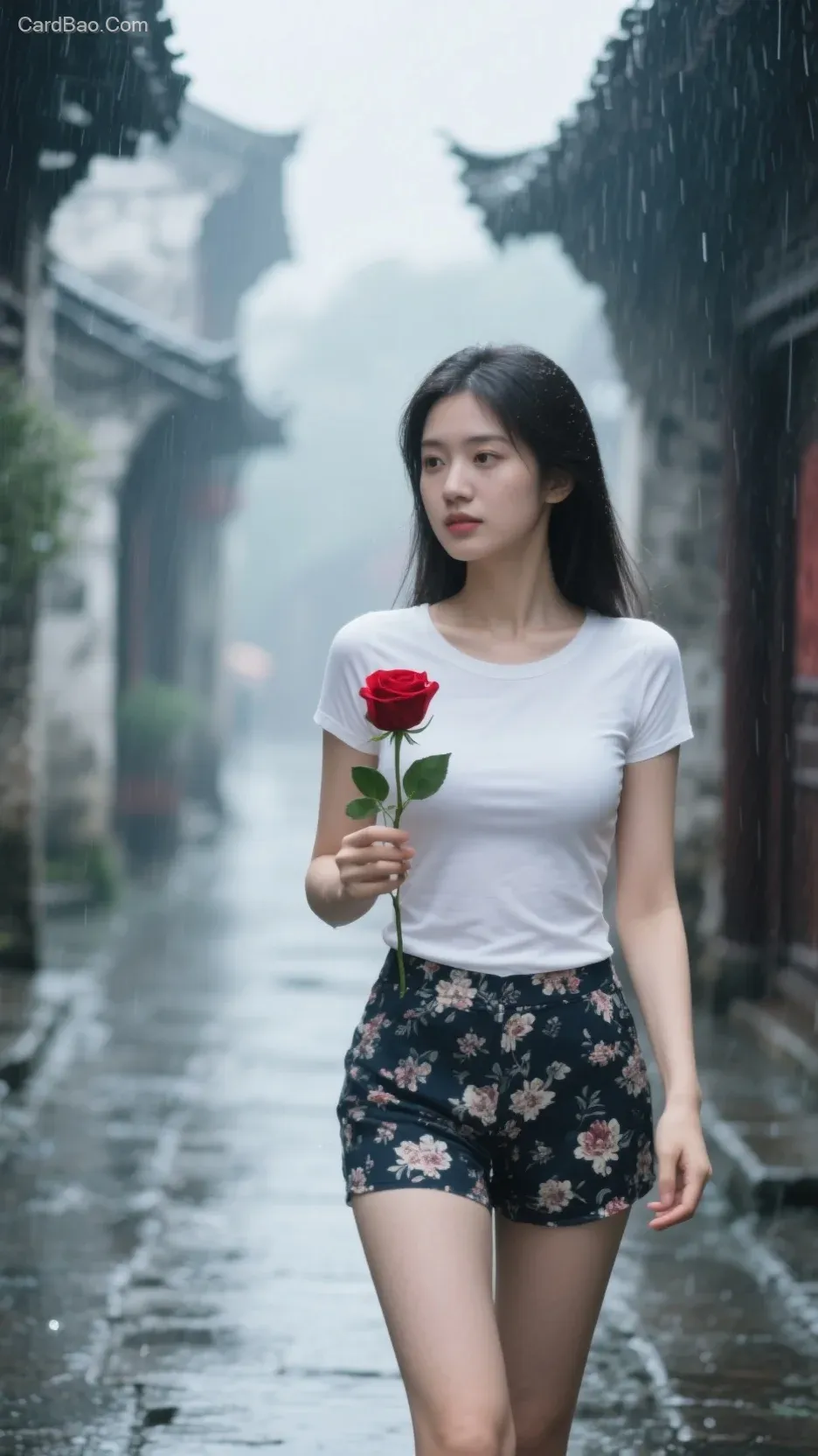 On a quaint street veiled in a light drizzle, a tall and beautiful woman, wearing a form-fitting light white short-sleeved top and dark floral-print shorts, walks slowly toward the camera, holding a red rose in her right hand.