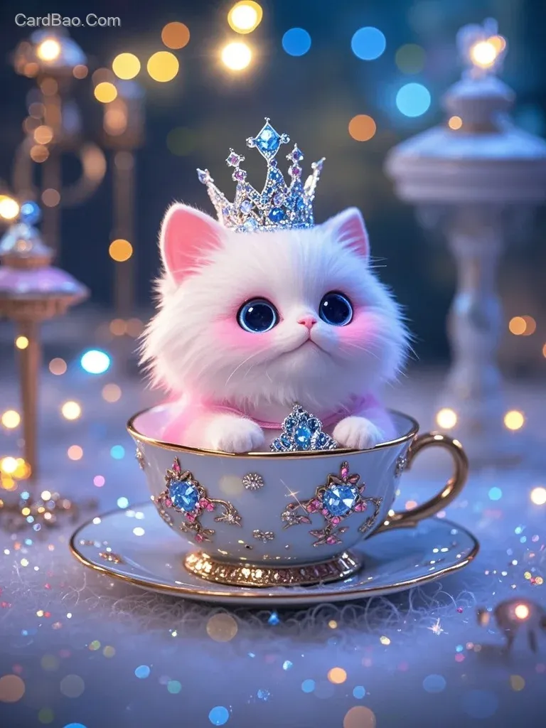 微缩景观,超级特写,浅景深,桌上茶杯里,有只可爱的白色迷你小猫戴着水钻皇冠,奢华精美,周围星光闪闪,梦幻的散景,流光,星汉灿烂,生物发光,超细节,3D立体