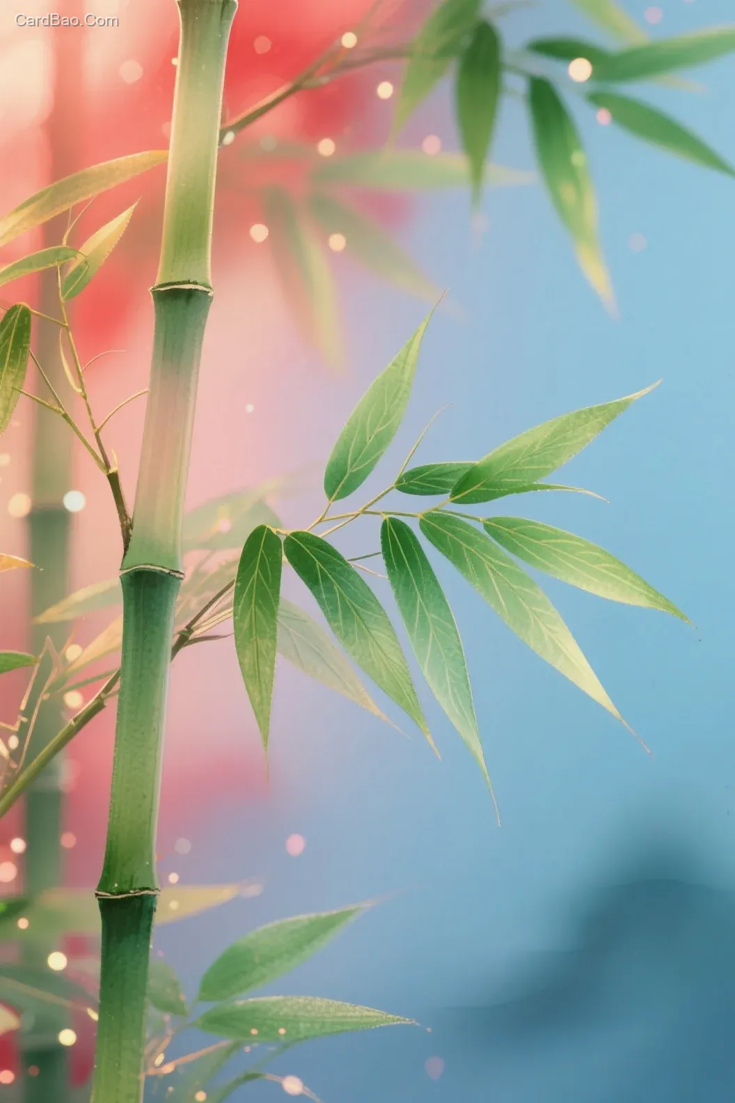 炫彩水墨画,淡金红蓝色氛围光,中景是优美的半透明竹子,竹叶脉络清晰如同精巧的纹路。竹叶是翠绿色渐变的,高清,光粒子效果,纯净极简,中式写意