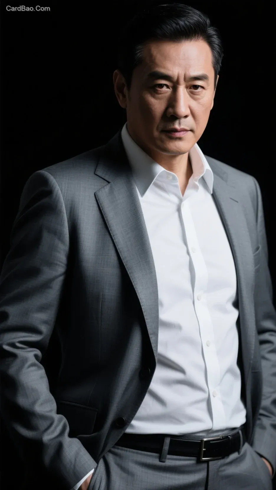 中国中年霸道总裁,着灰色西装 ,白色衬衫,一脸霸气,面部表情特效