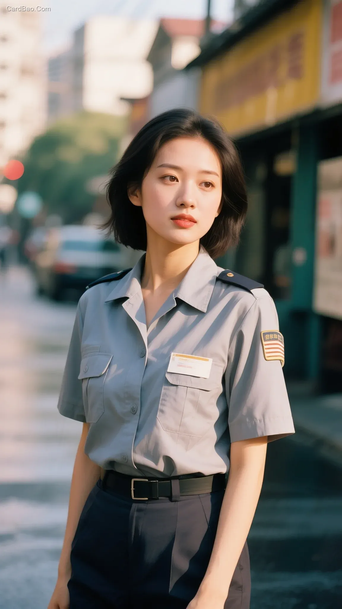 真人写真,一位绝色美人,五官精致,半身照片穿着工作制服。镜头拉远,远景
