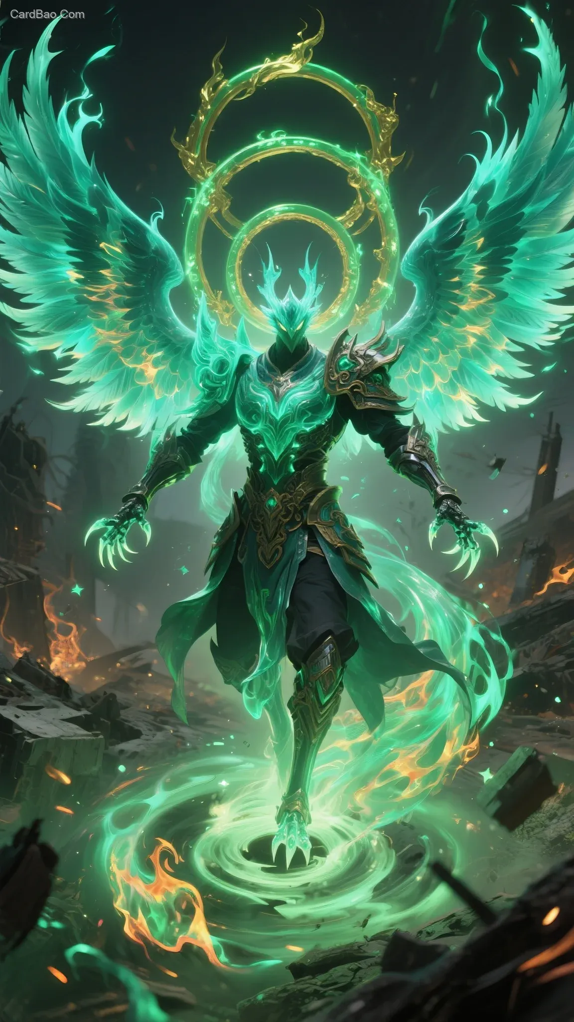 神鸟青鸾化形武帝形态,青炎羽翼每片翎毛燃烧半透明青焰,琉璃战甲嵌合凤纹能量回路,双爪撕开空间裂缝迸发粒子星火,背后悬浮三重青金色神环,战场废墟中升腾能量漩涡,玄幻造型与机械羽翼结合,冷焰与霓虹光效交织,俯冲视角强化视觉冲击力,8k级火焰粒子系统,虚幻引擎实时流体模拟渲染