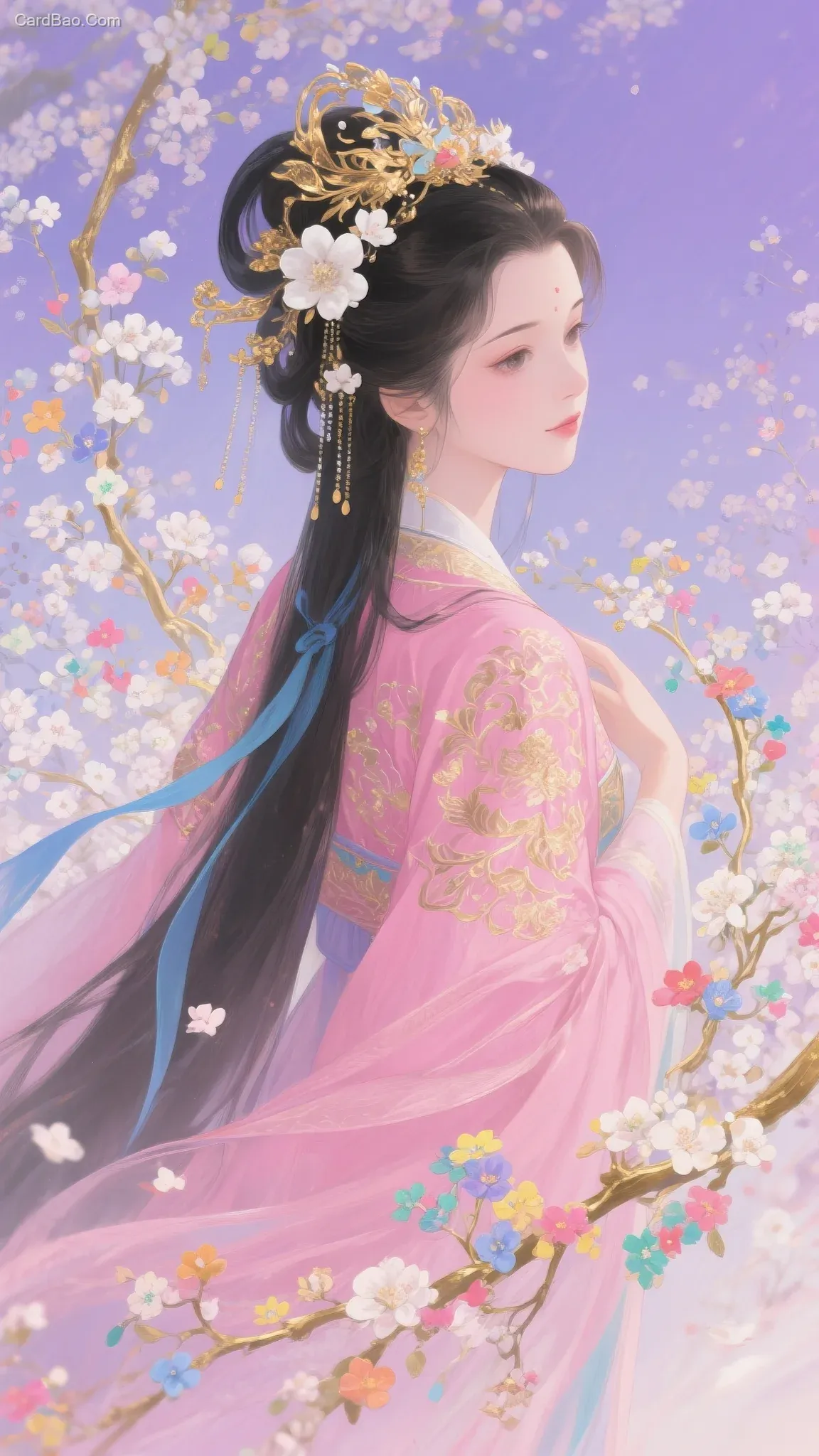 “一幅华丽精美的东方古典美人图,她坐在古风的窗台旁边欣赏花,一位身着粉色为主、带有金色花纹点缀的传统汉服的女子,长发,精致的饰品,发饰,造型别致,插满了金色的华丽发饰与白色花朵,部分发丝如蓝色丝带般垂下。周围环绕着金色的花枝,开满五颜六色的满天星小花,背景是柔和的粉紫色渐变色调,背景全是满天星的花朵。营造出梦幻、高贵又典雅的氛围,画面用细腻的笔触展现出服饰的精致纹理与装饰的华丽,光线柔和且富有层次感,突出浪漫的古典宫廷美感” 。你可以说说对这个提示词的感受,比如想调整色彩浓度、改变氛围风格等,我来进一步优化 。比例 9:16。肌理,厚涂人像,油画晕染。高品质。古风女子。国漫插画。超清画质。