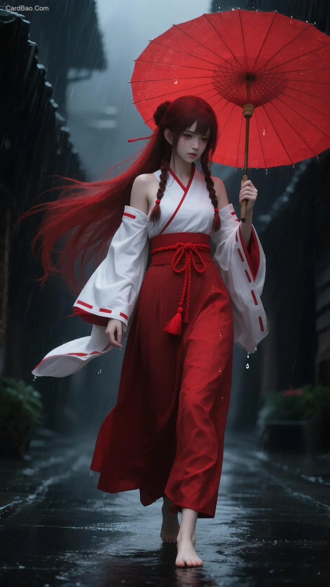 Full-frame low-angle shot, ultra-high-definition CG, cinematic quality. [Uesugi Eri] has dense, waist-length red hair (with two strands tied into short braids in front of the ears). It is a rainy night, and she is wearing an exquisitely modified red and white miko outfit (with shoulders exposed, sleeves adorned with red decorative stripes, adding dynamic layers. A meticulously designed red knot with tassels on the chest highlights traditional Japanese charm. A red obi is tied at the waist, emphasizing refined details and unique aesthetics. The overall design blends traditional Japanese elements with modern modifications, with the white top and red long skirt complementing each other. The fabric texture is delicate, and the decorative details are rich, presenting a unique style that combines classical elegance and modern fashion. The red long hair echoes the color of the outfit, enhancing the visual impact and creating a cinematic-level exquisite visual effect.) Her pale skin is visible, with wet hair clinging to her collarbones. She walks barefoot and alone on a dark night street, holding a red oil-paper umbrella in her right hand. A teardrop hangs suspended beneath her chin. The scene conveys a sense of loneliness and sorrow.