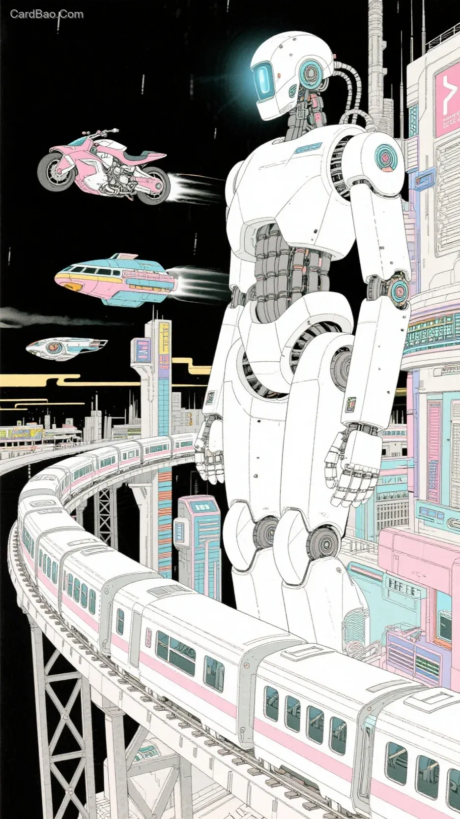 大友克洋作品,白描工笔插画,机械都市,巨大机器人,轨道,飞天摩托,悬浮火车,各种飞行器。未来主义风格融合赛博朋克和超现实主义,明暗对比强烈,波普艺术与包豪斯元素组合。马卡龙配色