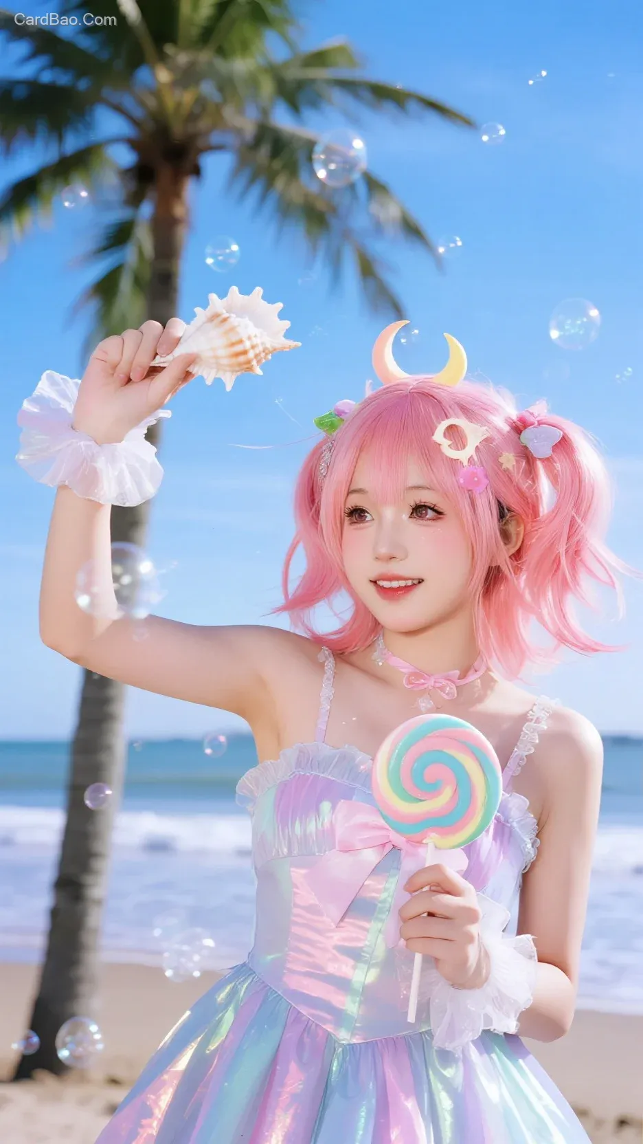 Anime cosplayer: Peach-colored jellyfish hair + starry lollipop halter dress + holographic moon hair accessory + under a beach coconut tree + posing with a seashell towards the waves + glowing bubble atmosphere