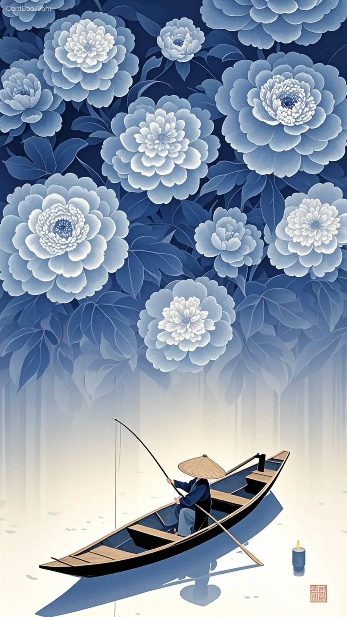 平面矢量插画,密集大量蓝色白色牡丹花的传统连续纹样花的图案,这些密集的图案从底部向顶部逐渐变淡,背景漫反射光,形成一种视觉上的渐变效果。在画面上有一个极小的人在船上垂钓。极致高清,极致细节,国风,杰作。