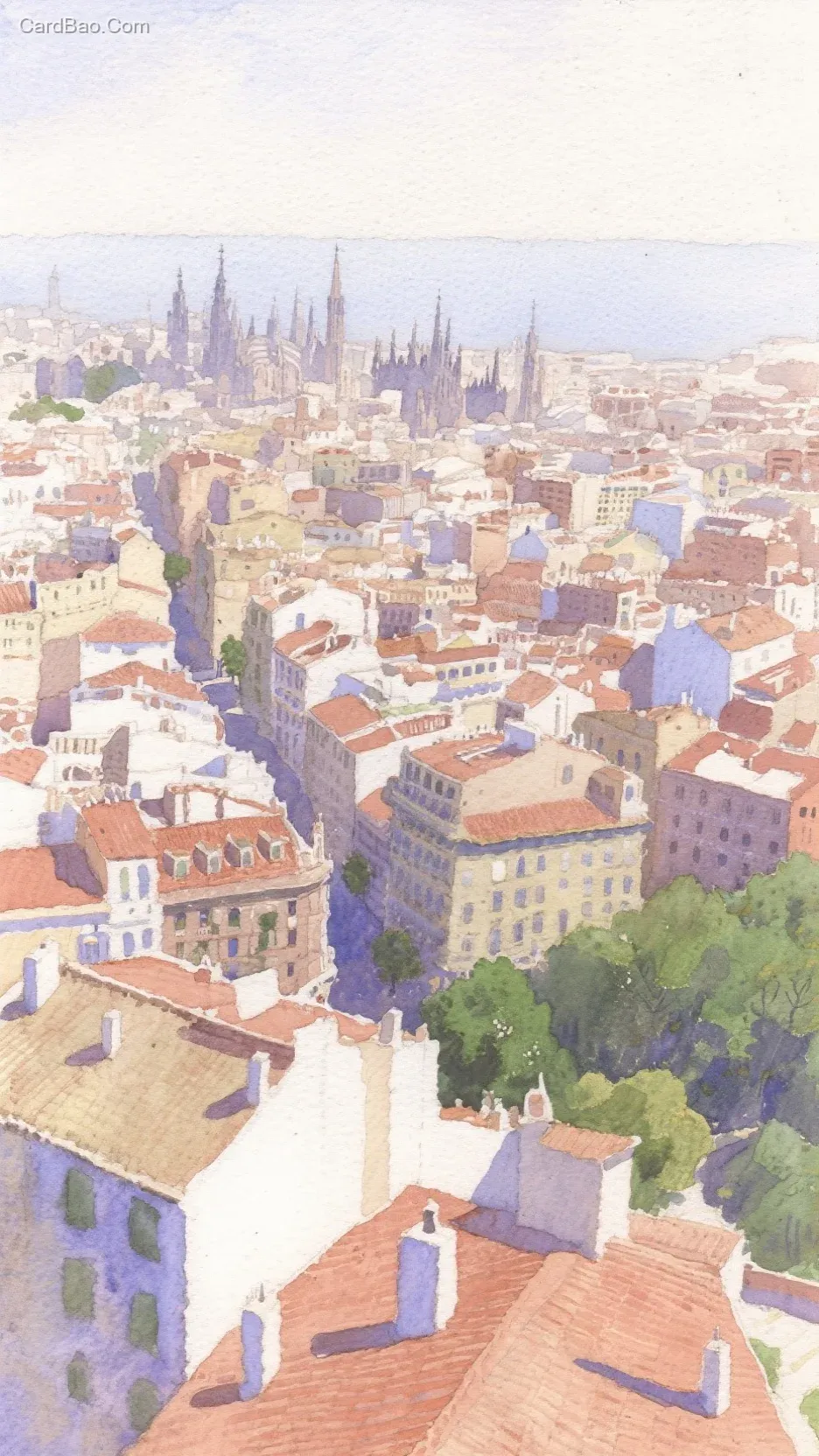 西班牙巴塞罗那城市鸟瞰水彩画,湿画法,有水彩特有的晕染效果跟透明感,高清