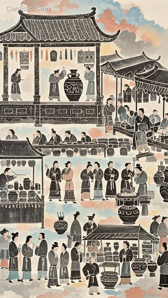 Han Dynasty stone reliefs, polychrome painting, painted pottery patterns, black pigment drawing, grand assembly scene of ancient China's Qin Dynasty.