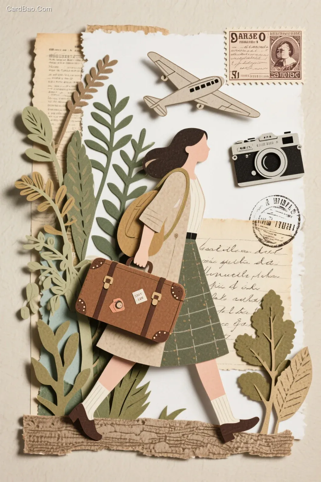 剪纸、剪纸艺术、纸张插图、以自然为灵感的拼贴风格艺术品。行走的女性旅人,旅行箱,植物插图、复古飞机、复古相机,复古邮票,手写笔记、压花,分层构图,有机纹理、怀旧感、艺术编排、手工美学,拼贴,创意组合,混合媒体达达主义