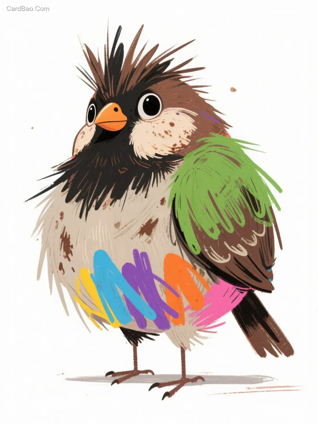 Creative art illustration, fun, humorous, very interesting punk-style fat finch, puffed-up feathers, messy, dirty, childlike doodles, organically clumsy brushstrokes, bold painting style, children's drawings, layered fibers in green, blue, purple, yellow, orange, and coffee brown with pink, white background, conceptual, CG art, minimalist, high-end, masterpiece.