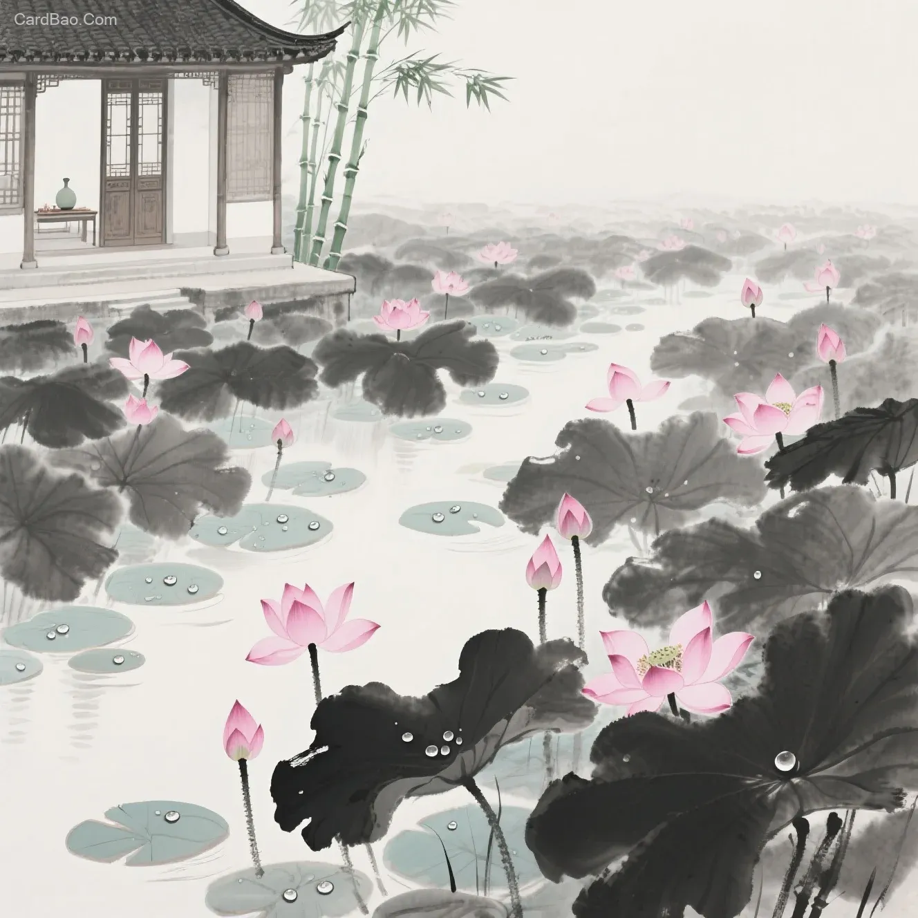 满池荷花以水墨点染,粉色荷花或绽或苞,荷叶田田,以浓淡墨色区分层次。露珠在荷叶上滚动,用留白表现晶莹。池边有一禅房,门窗古朴,禅房旁翠竹几竿,整个画面充满中式水墨独有的禅意与诗意
