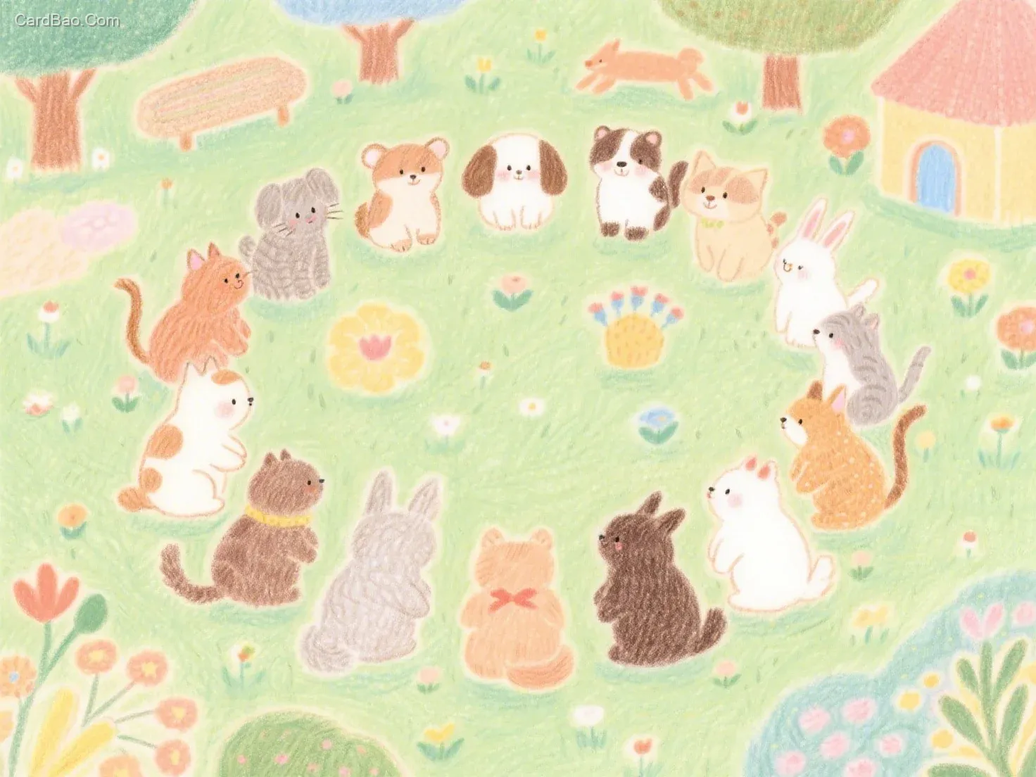 Jinhee Lee风格,小动物,乐园,温馨,温柔,细腻柔和,彩铅,平面,小动物都在边边上围成一圈