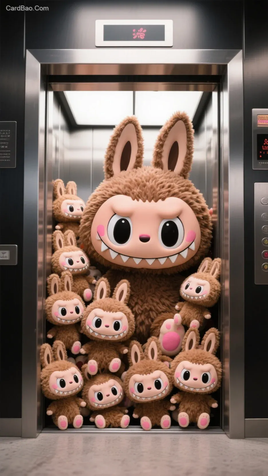 高级感的电梯,电梯门打开,电梯箱堆满了毛绒绒的拉布布玩偶,泡泡玛特,卡通风格,拟人化角色,兔子耳朵,棕色毛发,大眼睛,黑色瞳孔,九颗尖牙齿,粉红色脸颊,丰富的细节,高级构图,高级的光影,摄影作品