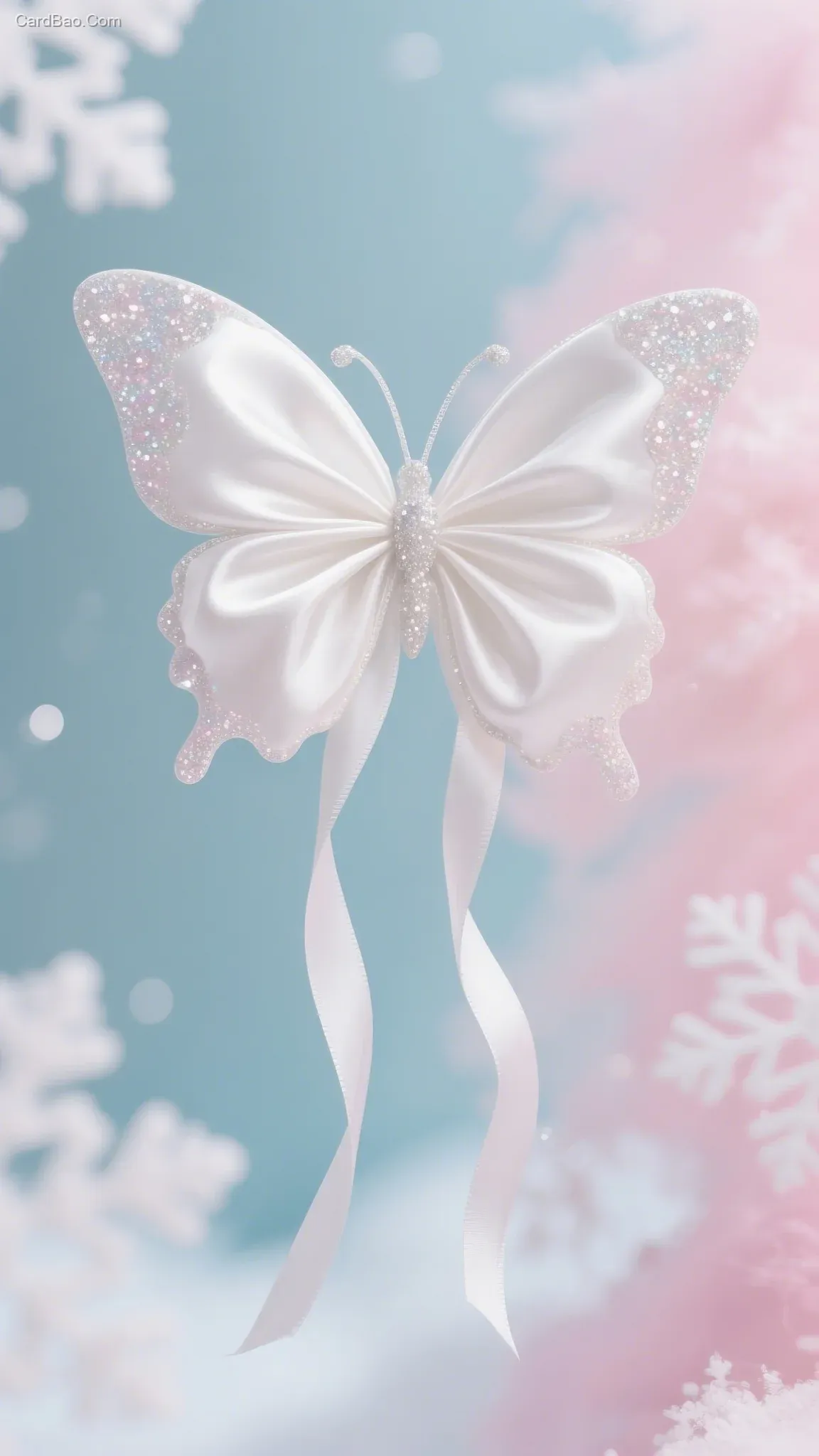 图中展示的是一个装饰性蝴蝶,主体是带有闪粉的白色缎面材质,下方用细细缎面垂挂着丝带,整体风格精致优雅,奢侈,优雅、精致,浪漫华丽的氛围。,梦幻,粉色,浅蓝色,白色,远景拍摄,雪花,前景虚化