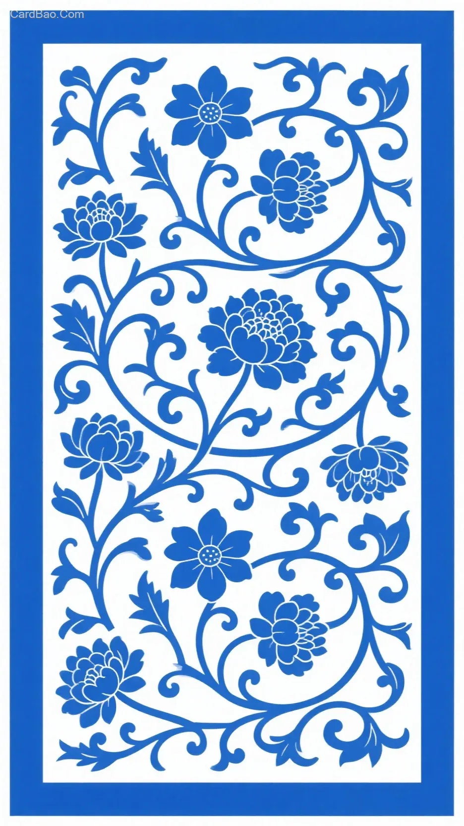 平面设计,缠枝花纹以藤蔓卷草为基本骨架,花朵、枝叶相互缠绕,连绵不断,其线条婉转流畅,富有动感和韵律,常见的花朵有牡丹、莲花、菊花等,这些花朵通常形态饱满、层次丰富,与缠绕的枝叶搭配,营造出华丽、繁茂的视觉效果构图,多个花枝上有五瓣圆形花朵,蓝色主调,画面有白色边框