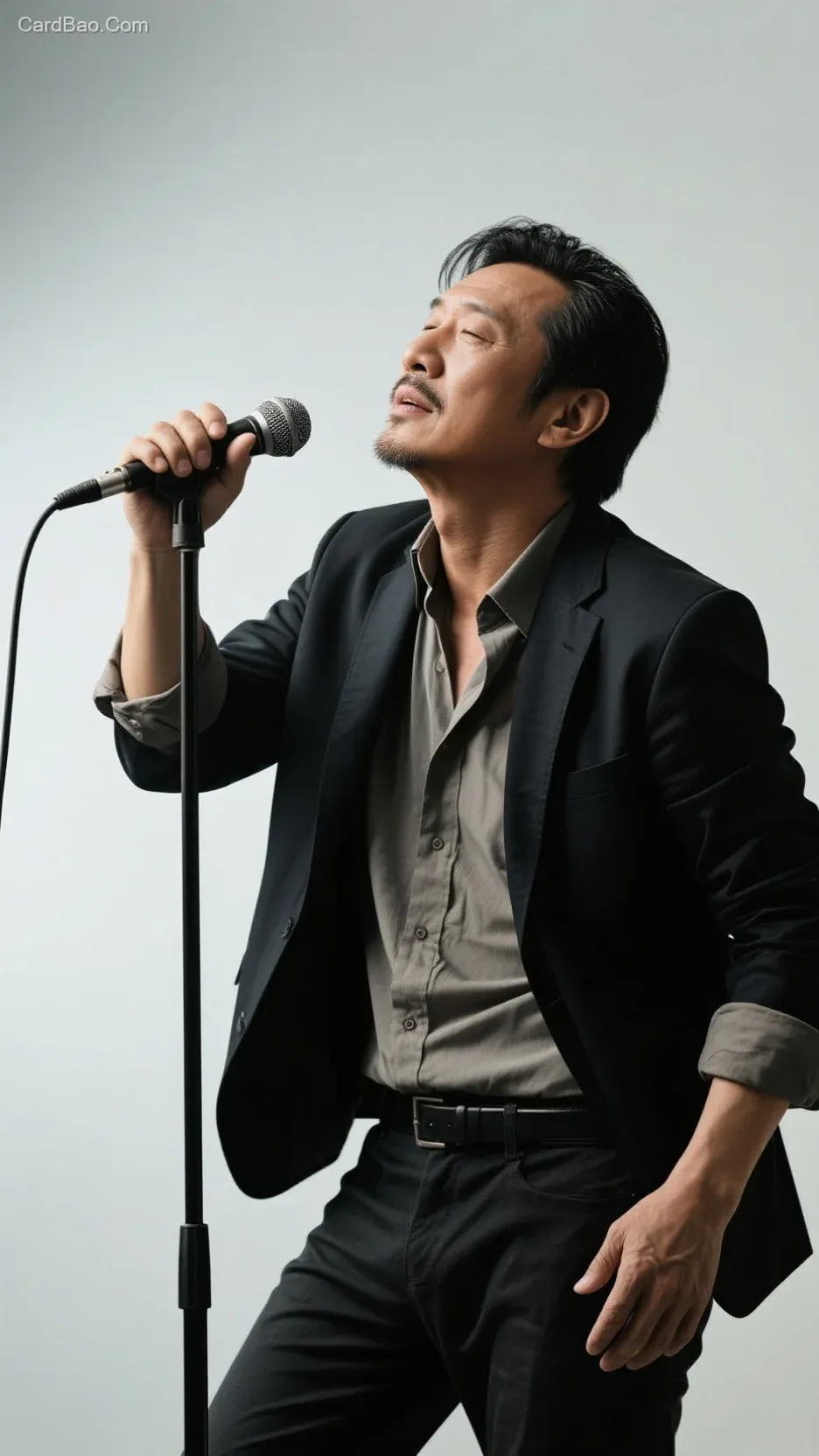 A middle-aged, suave man sings with a weathered voice, offering support.