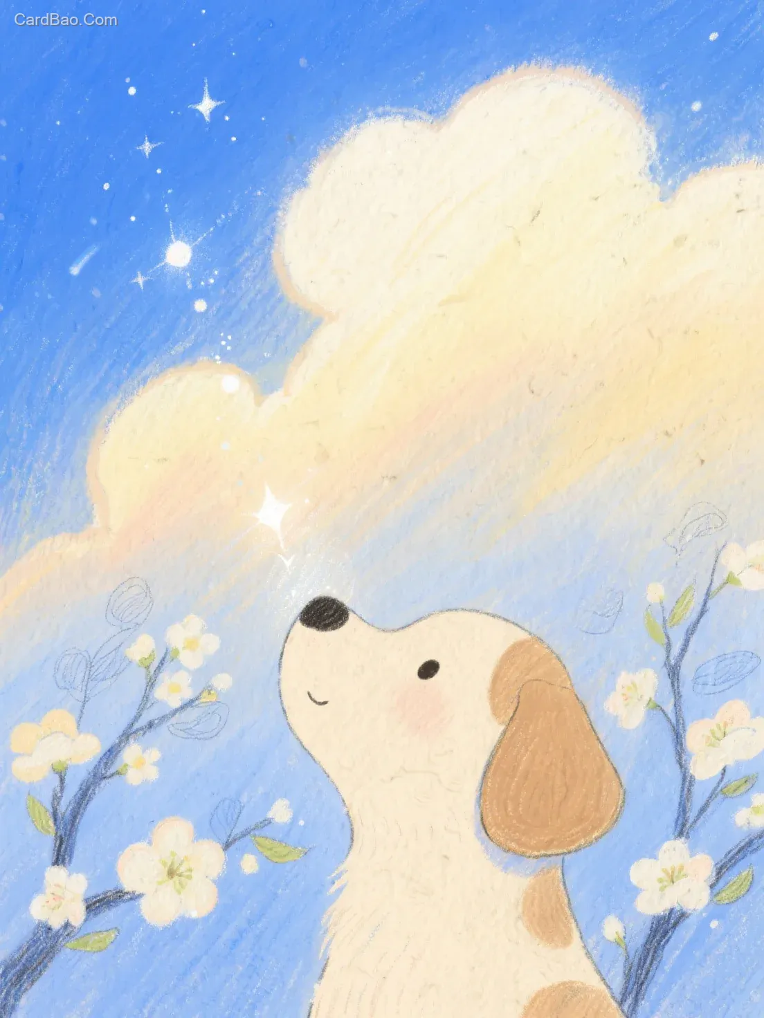 32K超清 治愈系水粉画,渐变天空,手绘蜡笔质感云朵,萌系狗耳角色仰望星空,半透明光斑粒子穿透梨花树,靛蓝与浅黄邻近色碰撞,未闭合线条保留铅笔草稿肌理,做旧羊皮纸纹理基底,晕染。