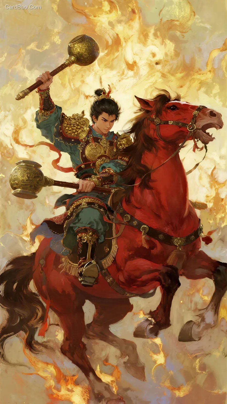 此为一幅精心绘制的泼彩水墨画作品,细节刻画入微,阴影处理细腻,具备伦勃朗风格,带有油画写实的质感和暗黑的色调,结合中西大写意的表现方式。画面的主角是中国古代战将岳云,他年轻帅气,金冠金甲加身,骑在一匹动态且姿态十分威武的大红马上,双手挥舞着两柄古代雕纹绣金大圆球金锤,一把在上,一把在下。大师级的构图使整个画面极具张力,正面,侧面。背景是火焰 并夹杂着金色的光影。 。图片风格为伦勃朗,比例 9:16。比例 9:16。图片风格为水墨,比例 9:16。