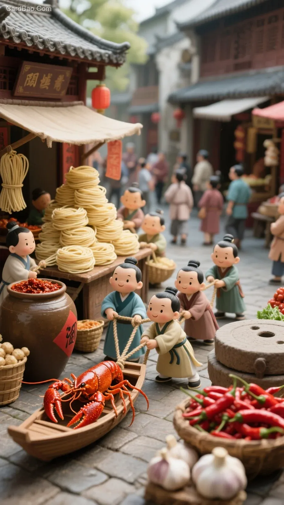 微缩景观,一群穿着汉服的可爱小人,在古风集市中穿梭购置食材。在水产摊前,一只体型如小船的小龙虾张牙舞爪,小人们齐心协力用绳索将其捆绑,准备拖走。不远处,卖面条的摊位上,碱水面条堆成了小山,每一根都比小人的手臂还粗。一旁摆放着大如磨盘的辣椒堆、蒜球,以及装满郫县豆瓣的巨型陶罐。画面聚焦小人努力搬运小龙虾和面条的场景,背景是古色古香的集市建筑,周围人来人往,热闹非凡。