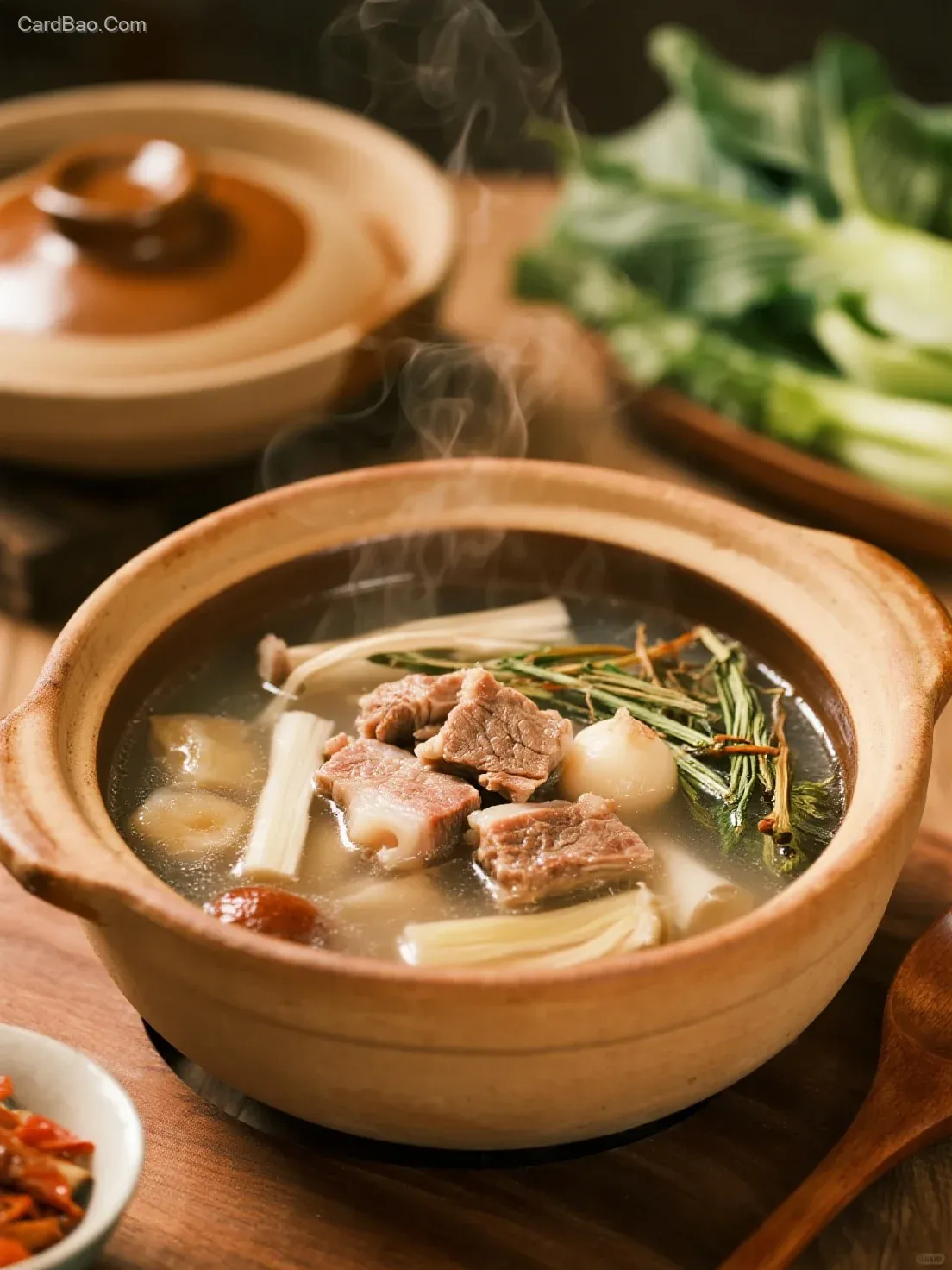 A pot of skin-soothing herbal soup is simmering in an earthenware pot, containing chunks of lean meat, tiger tooth grass, tamarisk, and coriander. Steam rises from the pot, with fresh ingredients placed beside it. PPT background image, realistic style, close-up shot, culinary atmosphere, vibrant colors, high clarity.