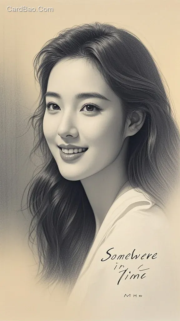 Her eyes are bright and sparkling; the corners of her lips are slightly upturned in a soft smile. The essence of her spirit is captured within the paper, enchanting viewers with this portrayal of youthful beauty. In the lower right corner, the title "[SOMEWHERE IN TIME]" is written in an elegant, classical cursive script.