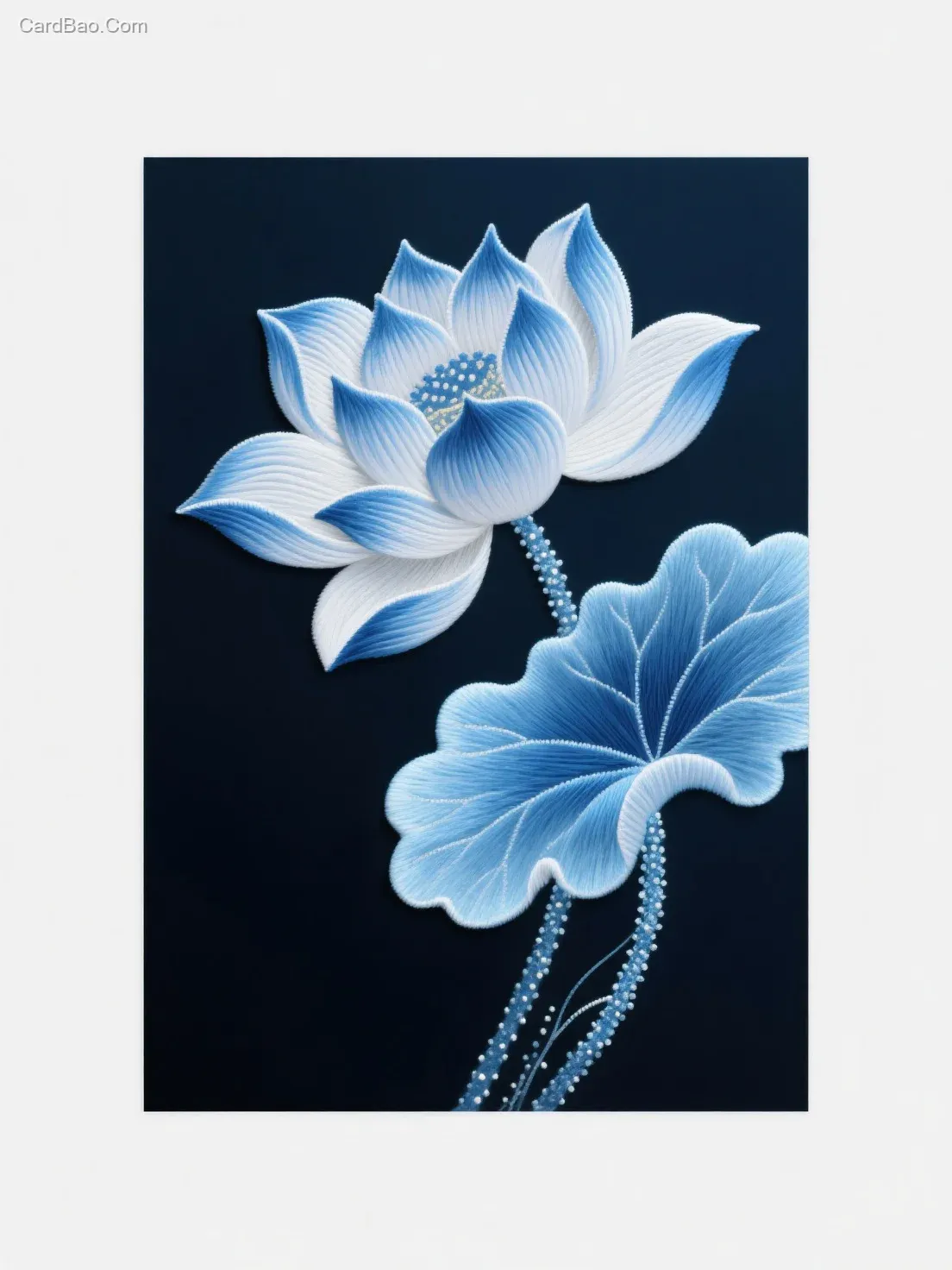 Ultra HD, inspired by traditional morning flower embroidery, featuring an elegant blue and white color scheme with a minimalist background that highlights sophisticated lines. Combining 3D dimensional art and natural lighting, professionally photographed to showcase delicate textures and a microcosmic world. Layers of lotus petals create depth, accompanied by a pale blue lotus leaf with vibrant colors, powder fluorescence, high saturation, lifelike details, particle glow, minimalism, 3D rendering, and ultra-high definition. A perfect fusion of Chinese aesthetics and modern design, exuding premium quality. The lotus petals emit a radiant lighting effect—masterpiece artwork in Chinese style, set against a dark background to emphasize the subject.