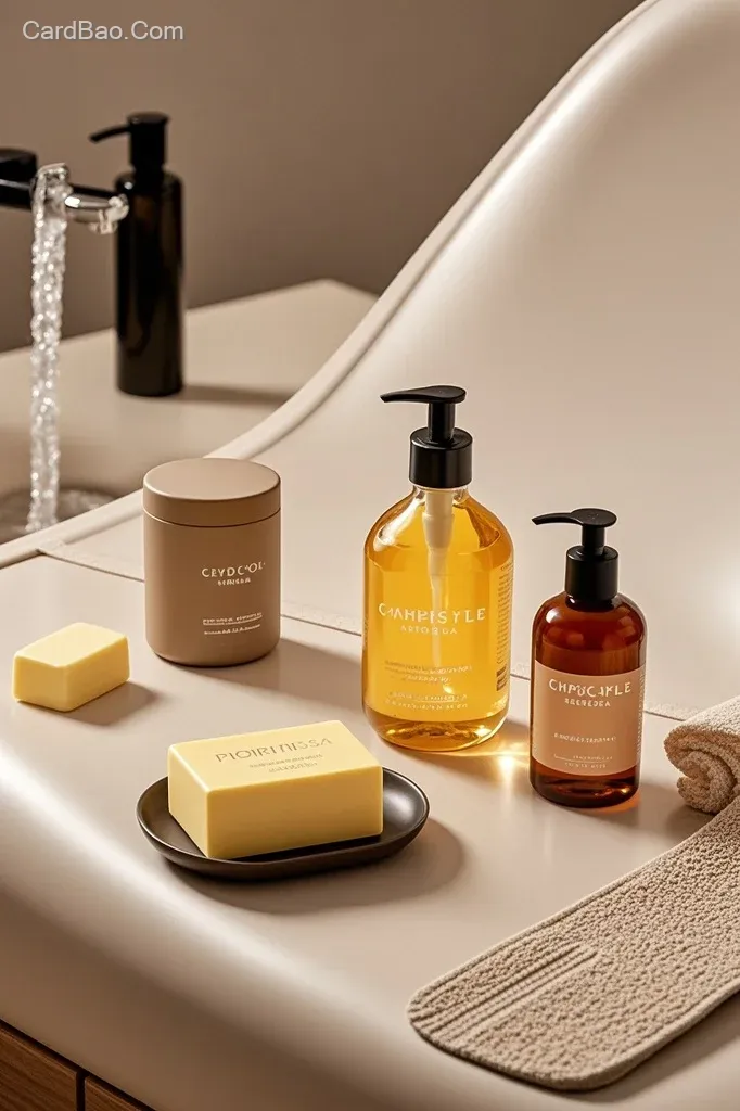 Hand soap, shampoo, body wash, and butter set, textured surface treatment style, minimalist ceramic, beige and amber tones, high-quality photo new concept, fully enclosed, tilted seat, futuristic, ultra-detailed, studio lighting.