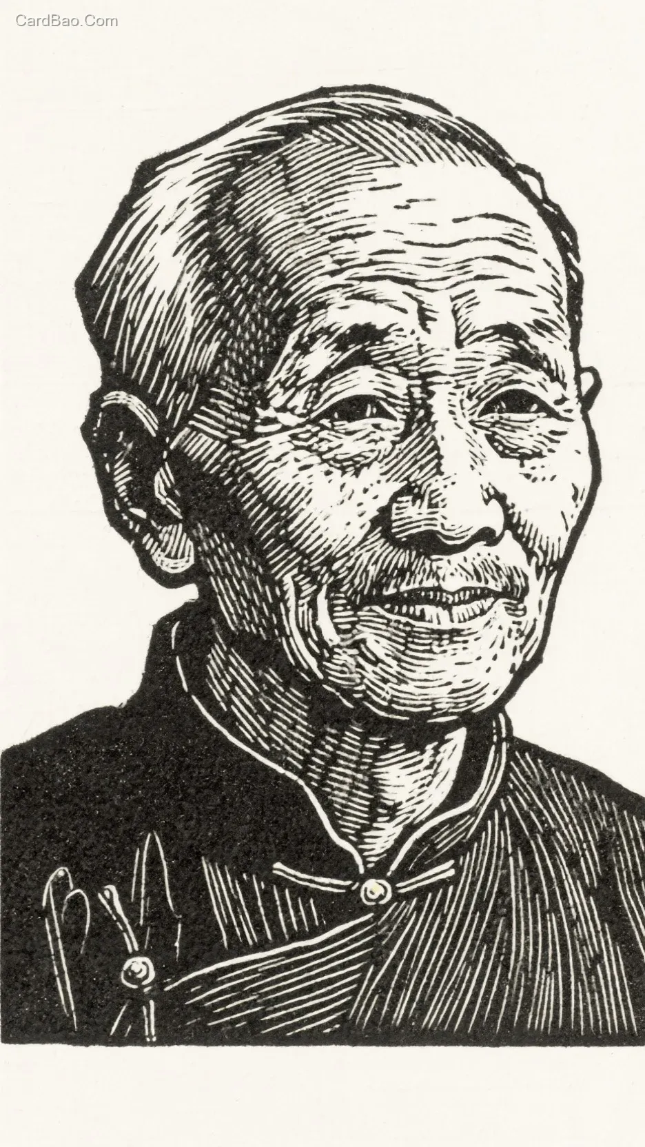 A Qing Dynasty old craftsman's portrait in line engraving style, with a 0.8mm thick line outlining the external contour, and 0.2mm fine lines detailing the surface skin texture, preserving black and white traces, monochrome.