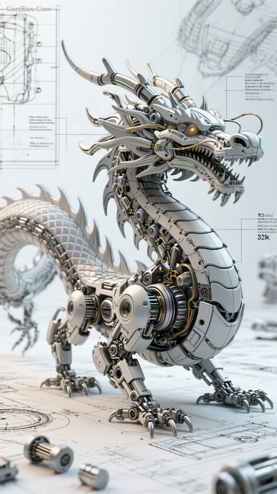 Mechanical Dragon Design Blueprint, Production Sketch, CAD Design Drawing, with sketch content consistent with mechanical dragon components. Ultra-high-definition imaging, 3D effect, OC rendering. Rich in detail, fine quality, 32K resolution.