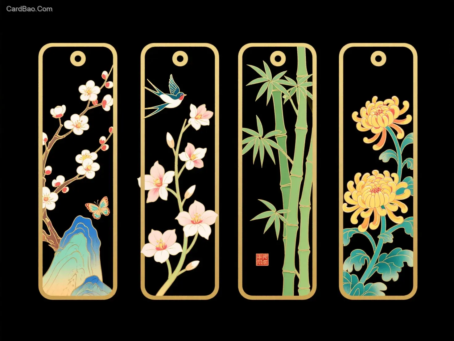 Four themed bookmark designs featuring plum blossom, orchid, bamboo, and chrysanthemum. Black background, front view. Each theme is presented in a narrow vertical rectangle with a Chinese trendy style, adorned with gold outlines. Small decorative elements such as rockeries, butterflies, and swallows are included for each theme, with vibrant colors.
