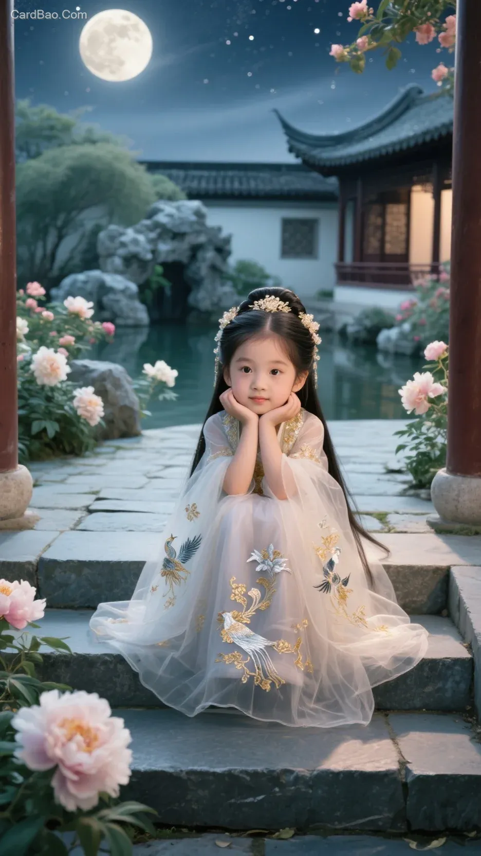 庭院中,青石板台阶纹理古朴,周围繁花似锦,牡丹、芍药争奇斗艳。远处,假山池沼相映成趣,亭台楼阁错落有致。空中,明月高悬,洒下银白清辉,繁星闪烁点缀夜空。月光倾洒,在小女孩身上形成柔和光影,与庭院景致相互交融,和谐美妙。画面构图精妙,将小女孩的娇俏与古韵庭院完美融合,尽显国风唯美与典雅。