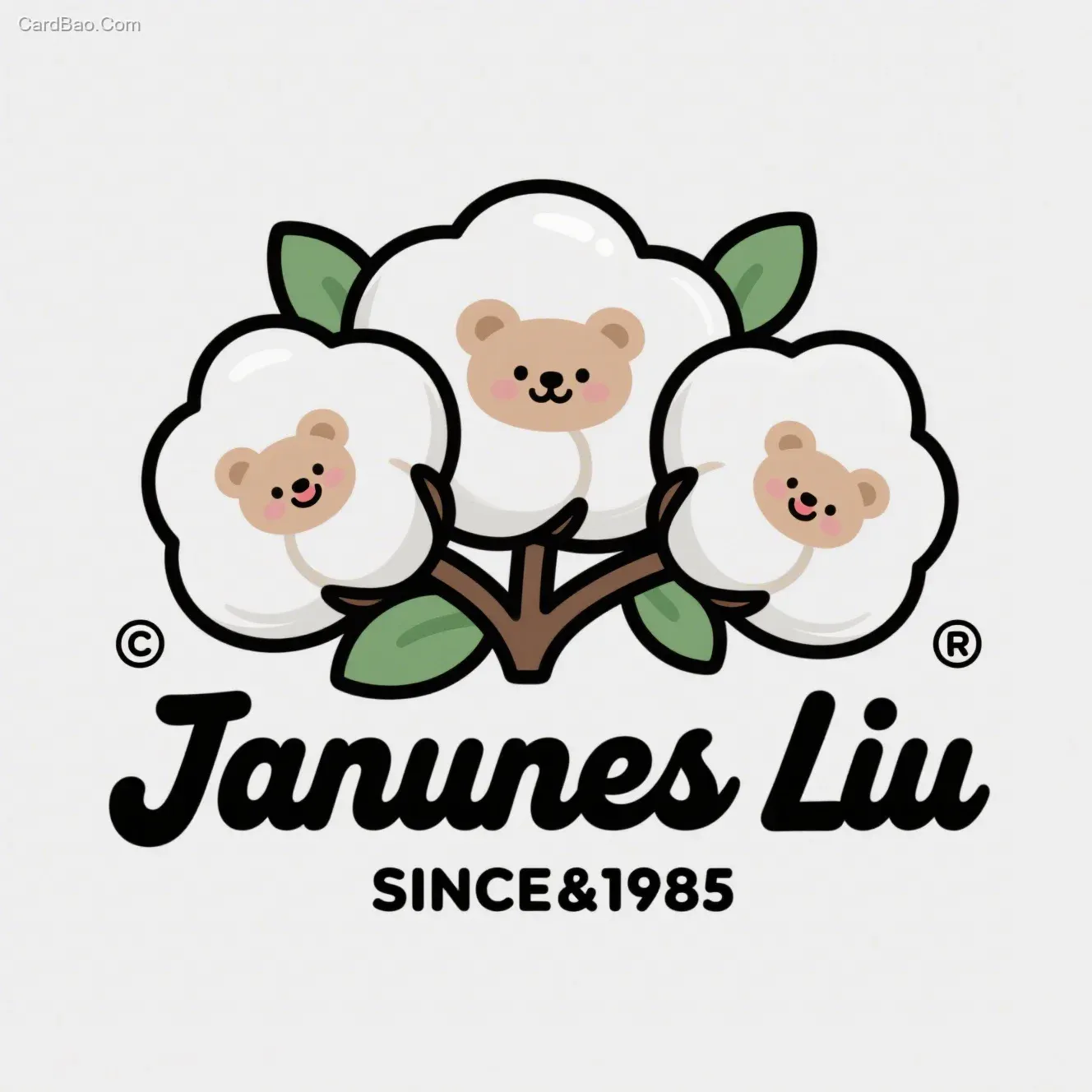 卡通可爱风格,特写logo画面,白色背景。三朵白色棉花图案,每朵棉花中有一个浅棕色小熊头像,表情各异,棉花上有绿色叶子点缀。下方有黑色手写风格英文“Janunes Liu” ,再下方有黑色文字“SINCE&1985” ,两侧分别有圆形标识