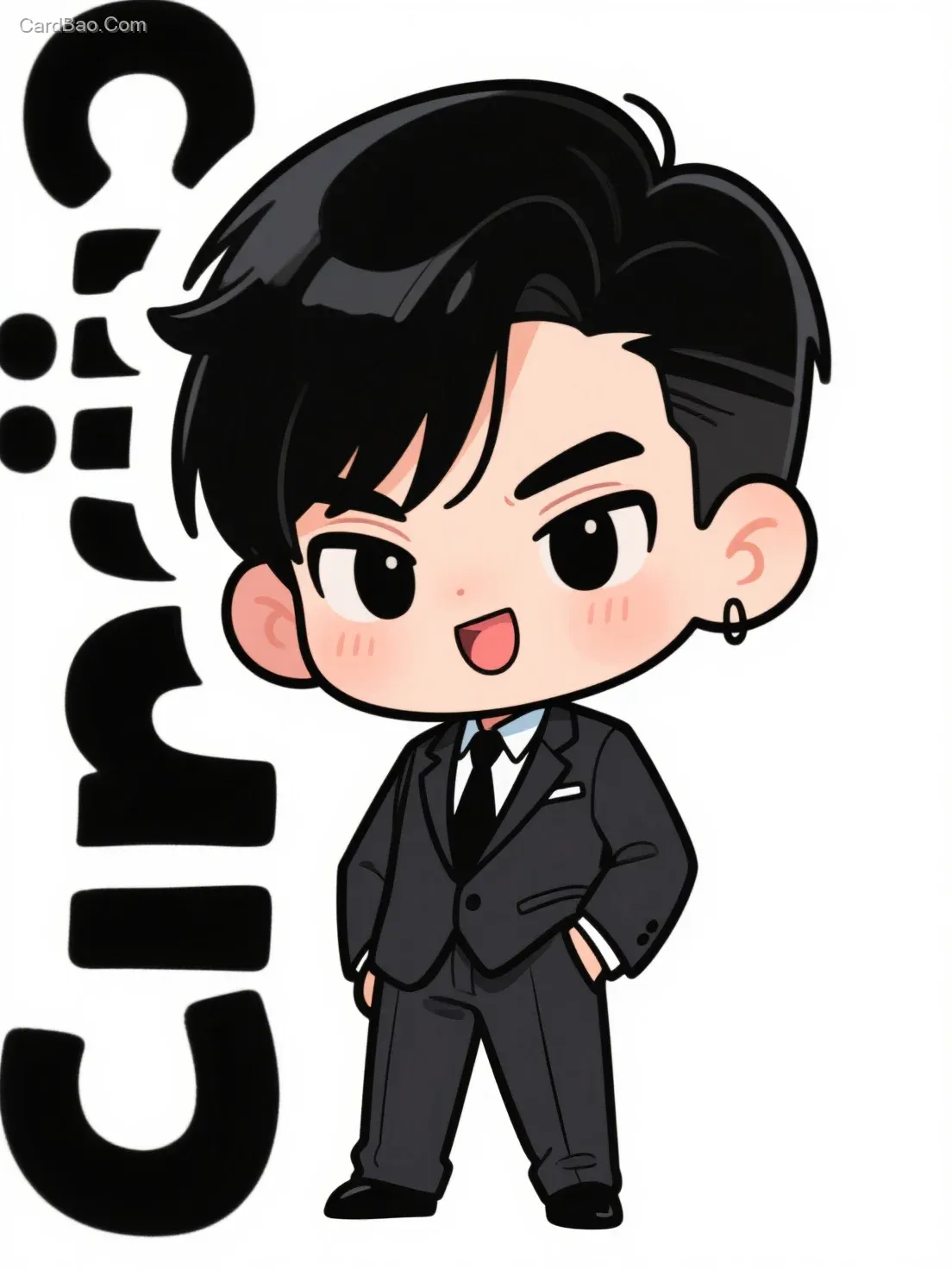 chibi,漫画风,痞帅,一个男人,黑色头发,穿着西装,霸总,表情夸张,萌萌哒