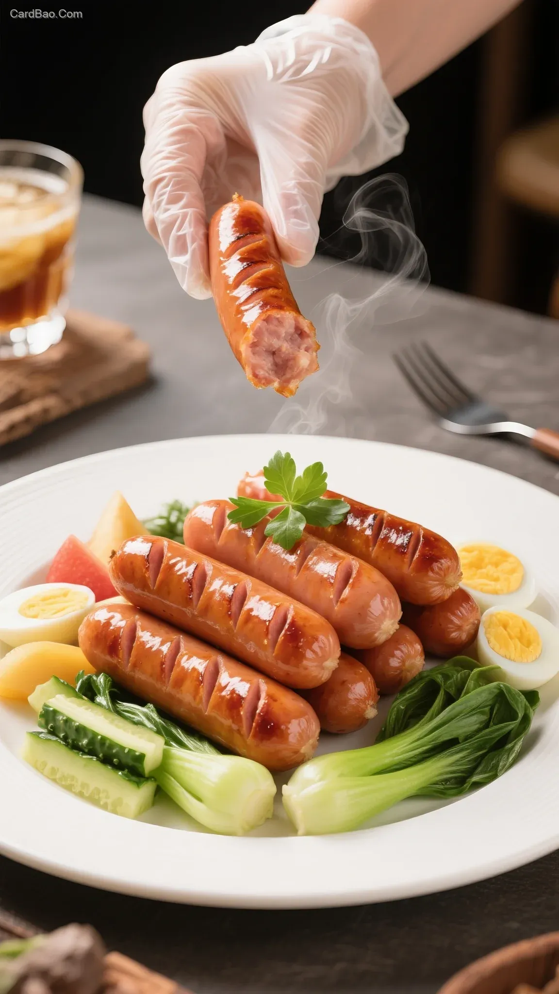 Generate an image: This photo is a promotional image for volcanic stone grilled sausages. On a white plate, there are six grilled sausages arranged neatly, each with diagonal cuts on the surface, glistening with an enticing, oily sheen. They are accompanied by sliced cucumbers, blanched baby bok choy, and chopped eggs, along with some fruit, all topped with green leaves for garnish, creating a rich and colorful composition. A hand wearing a transparent glove holds one of the sausages, which has been bitten into, revealing its tender and juicy interior. The sausage is steaming hot, adding to the appeal. The scene is set on a table, with a glass of drink and a fork in the background, enhancing the everyday, lifestyle atmosphere. The style of the image is photorealistic.