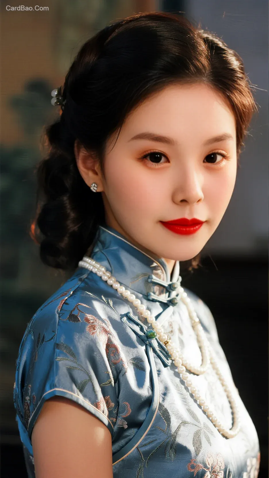 ## Image Generation Information: Slightly plump, beautiful and kind-hearted, elegant, wealthy aura, blue light, delicate and refined, perfect, dark brown long hair styled in an updo, cinematic lighting intensity, master quality high-definition photo, emphasis on the front of the subject, backlight photography, qipao attire, silk texture, embroidered three-dimensional patterns, ultra-short sleeves, wearing a long pearl necklace with a jade pendant, 32K resolution with background, wearing lipstick, front close-up.