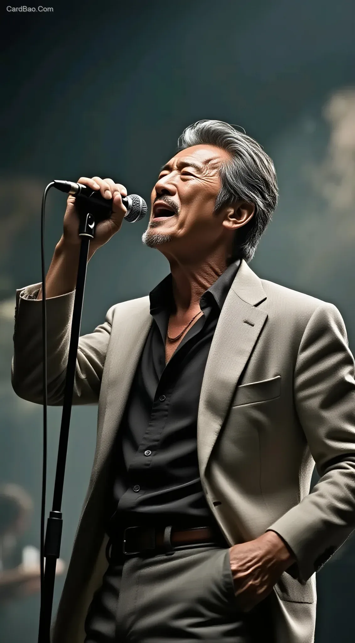 Photorealistic, a dashing middle-aged man with a weathered look singing a song, ultra-high-definition quality.