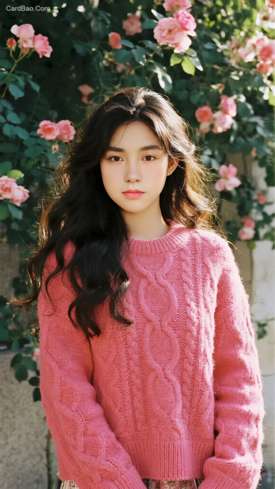 ##桃红色麻花长款大毛衣,长卷发多多卷,蓬松高颅顶,宽肩,蔷薇花墙背景,全身照,真实感。头顶很多小卷卷