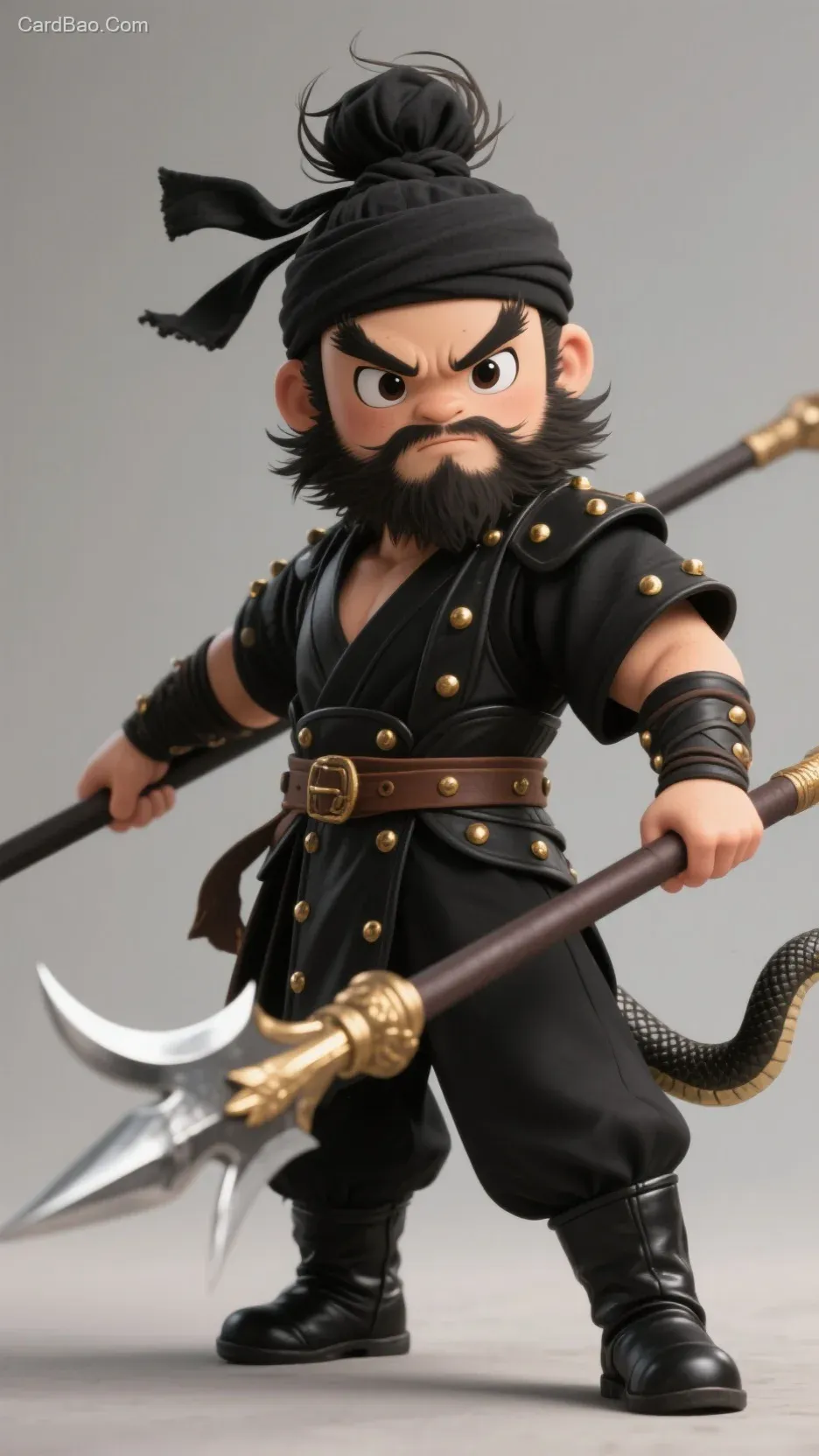 Chibi-style illustration prompt: Headwear is a black cloth head wrap tied casually into a knot, with a few strands of hair peeking out from the edges. A thick, full beard covers his face, with each strand clearly defined. He wears a black martial attire adorned with golden rivets, cinched at the waist with a brown belt to accentuate his burly physique. The lower body is clad in black trousers and black leather boots. He holds the "Zhangba Snake Spear" firmly in both hands, its tip gleaming coldly, poised in a fierce and ready-to-charge stance. His eyes are wide open, with an expression that is both straightforward and imposing.